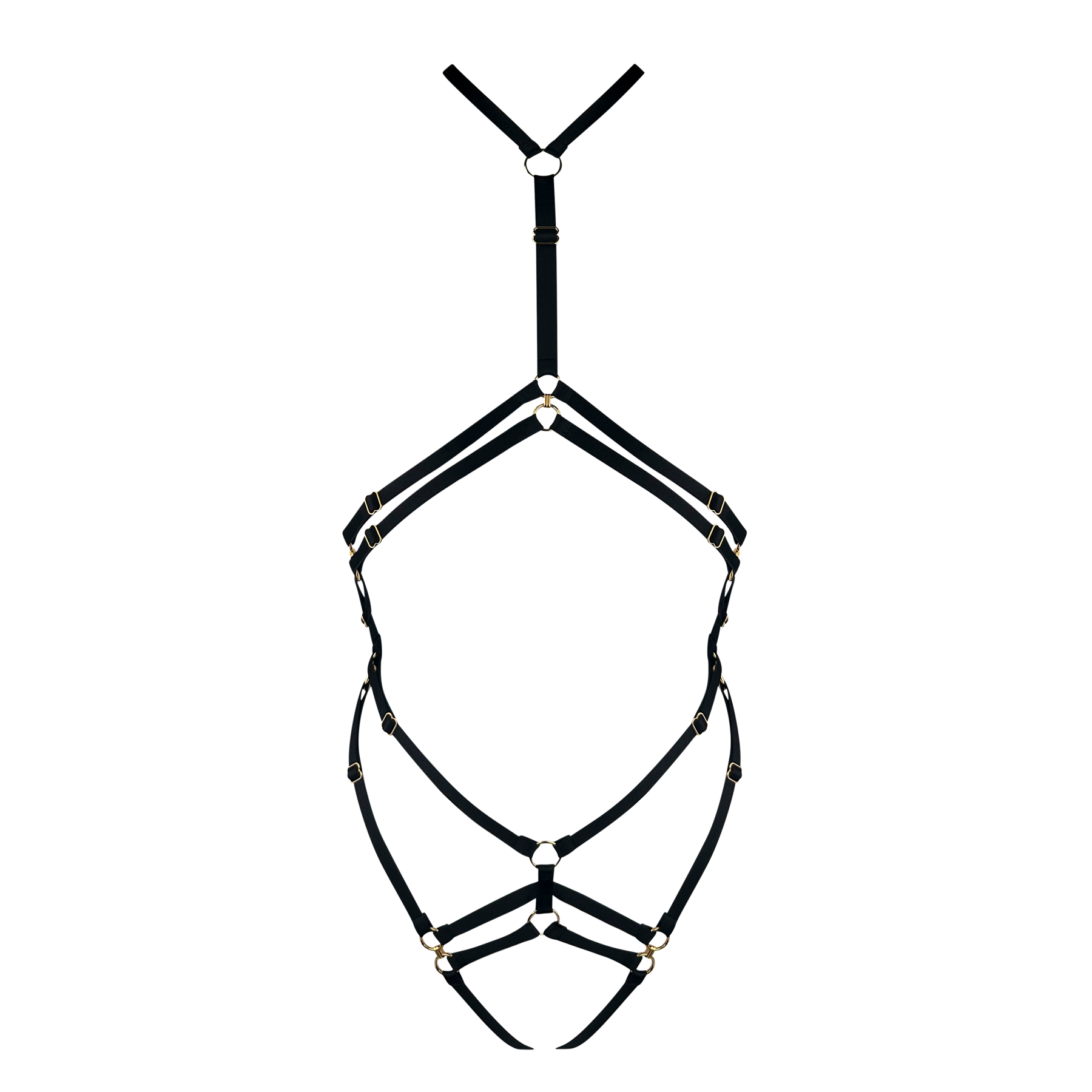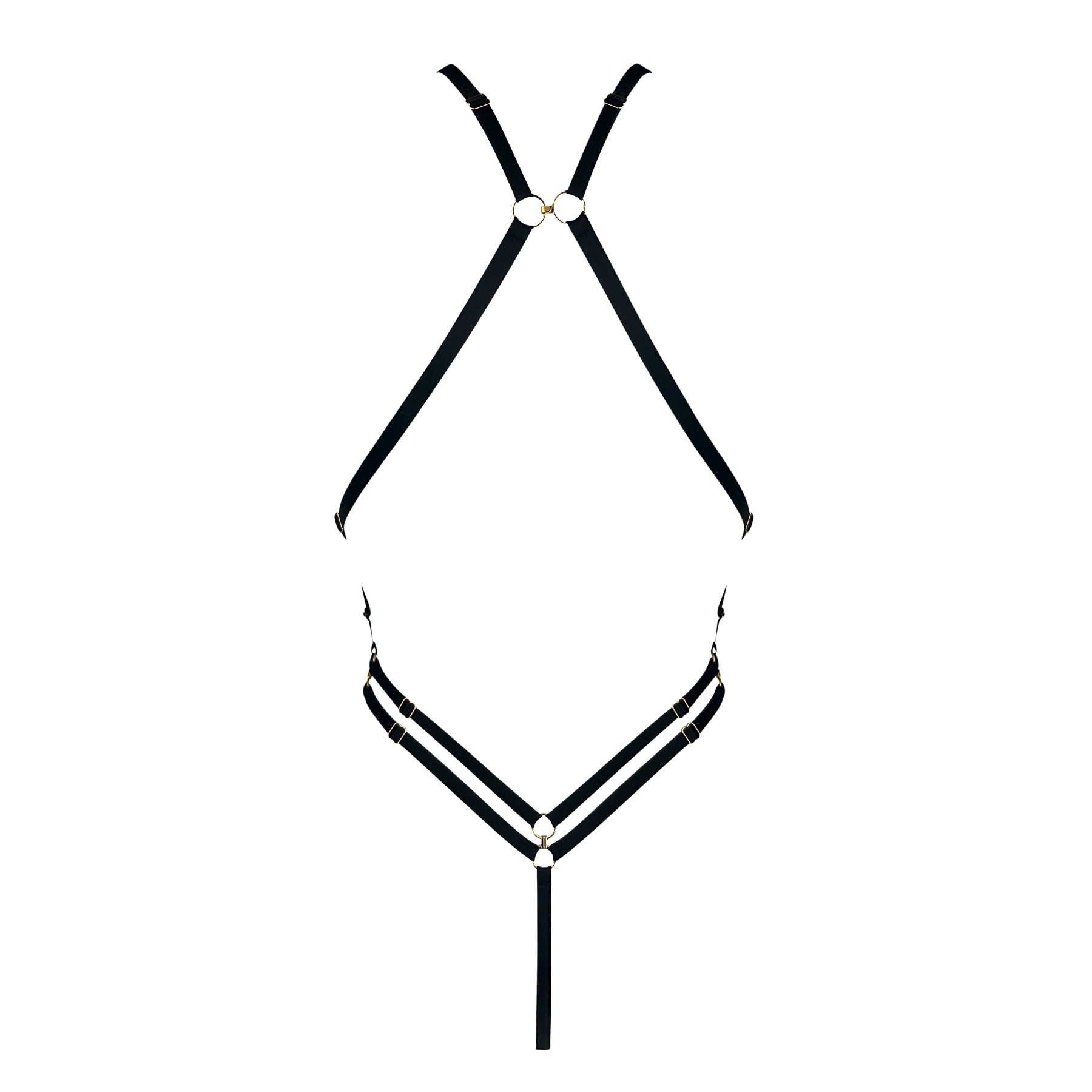 An entirely elastic lingerie harness featuring delicate signature satin elastic strapping. A refined take on bondage-inspired styling, the harness is designed for layering. Beautiful when paired with the Shell Nipplets, or daring when worn alone.