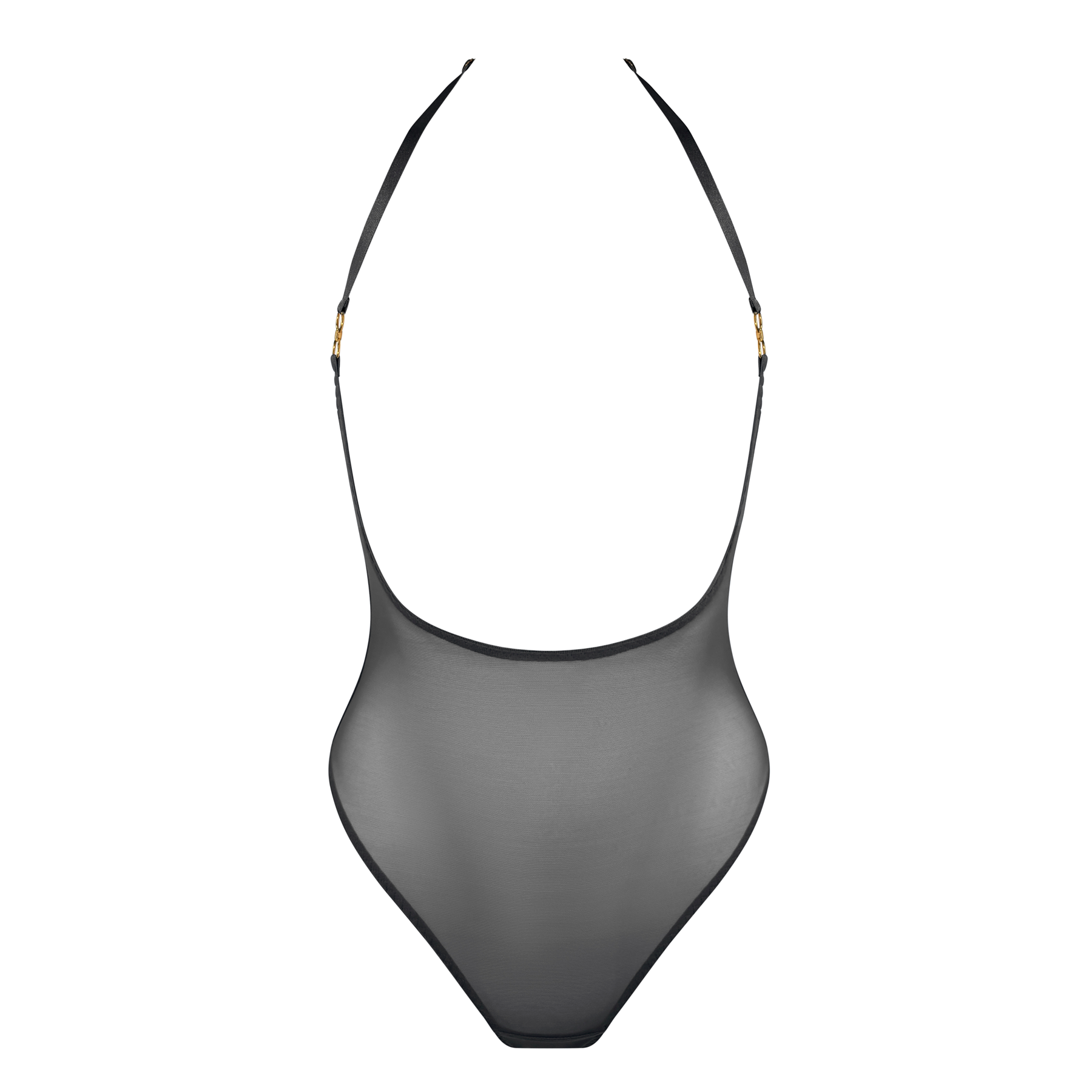An alluring open cup bodysuit crafted from soft sheer mesh and satin elastic strapping. The luxuriously soft mesh panel smooths into delicate straps extending to the neck and back. Perfect for layering or wearing alone, this piece creates an unforgettable statement.