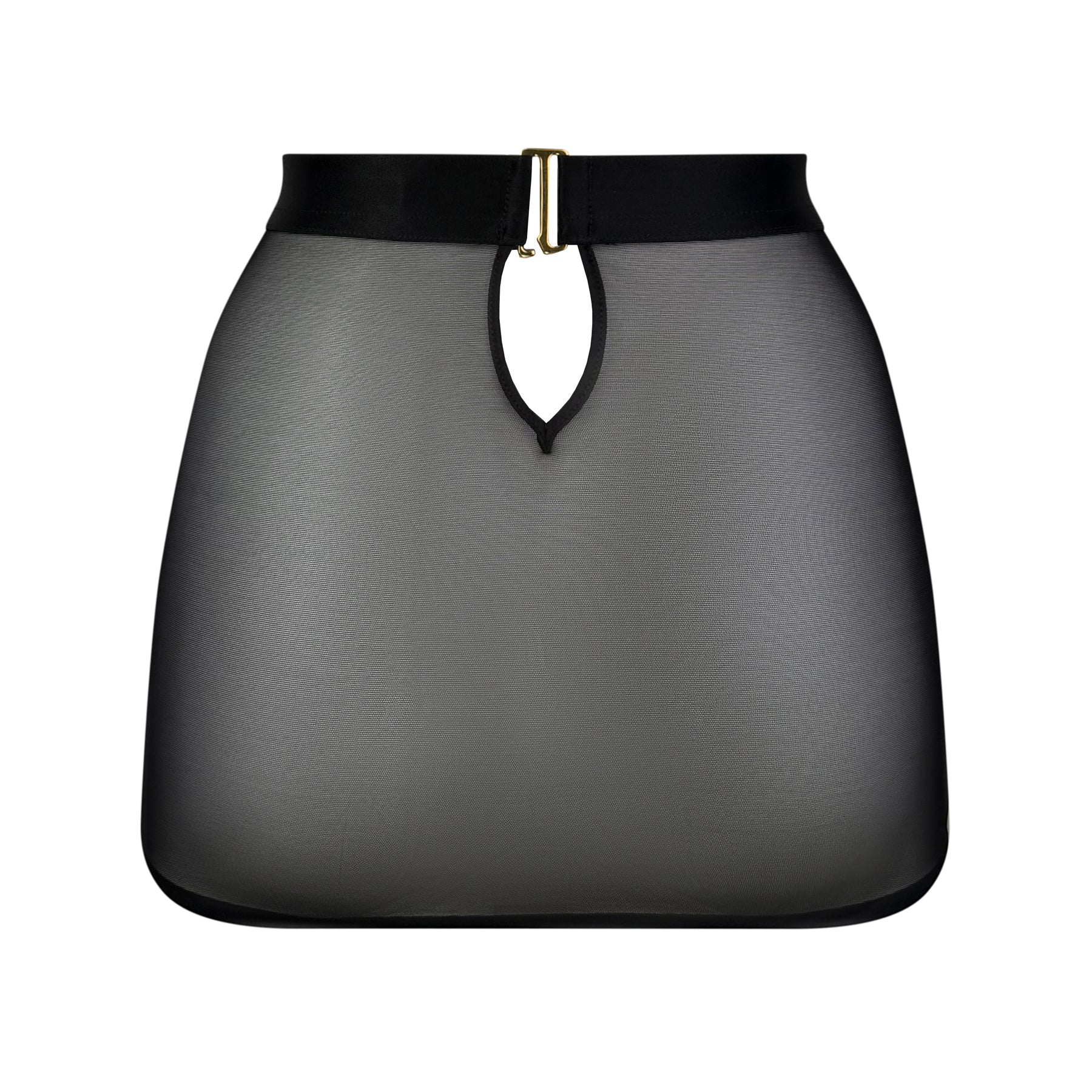 A luxury sheer mesh skirt designed to layer over lingerie, contouring and accentuating the waist and hips. The soft wide band elastic waist band fastens at the back with an oversized 24k gold plated swan hook, while two suspender clips at the side seams allow attachment to garters or stockings.