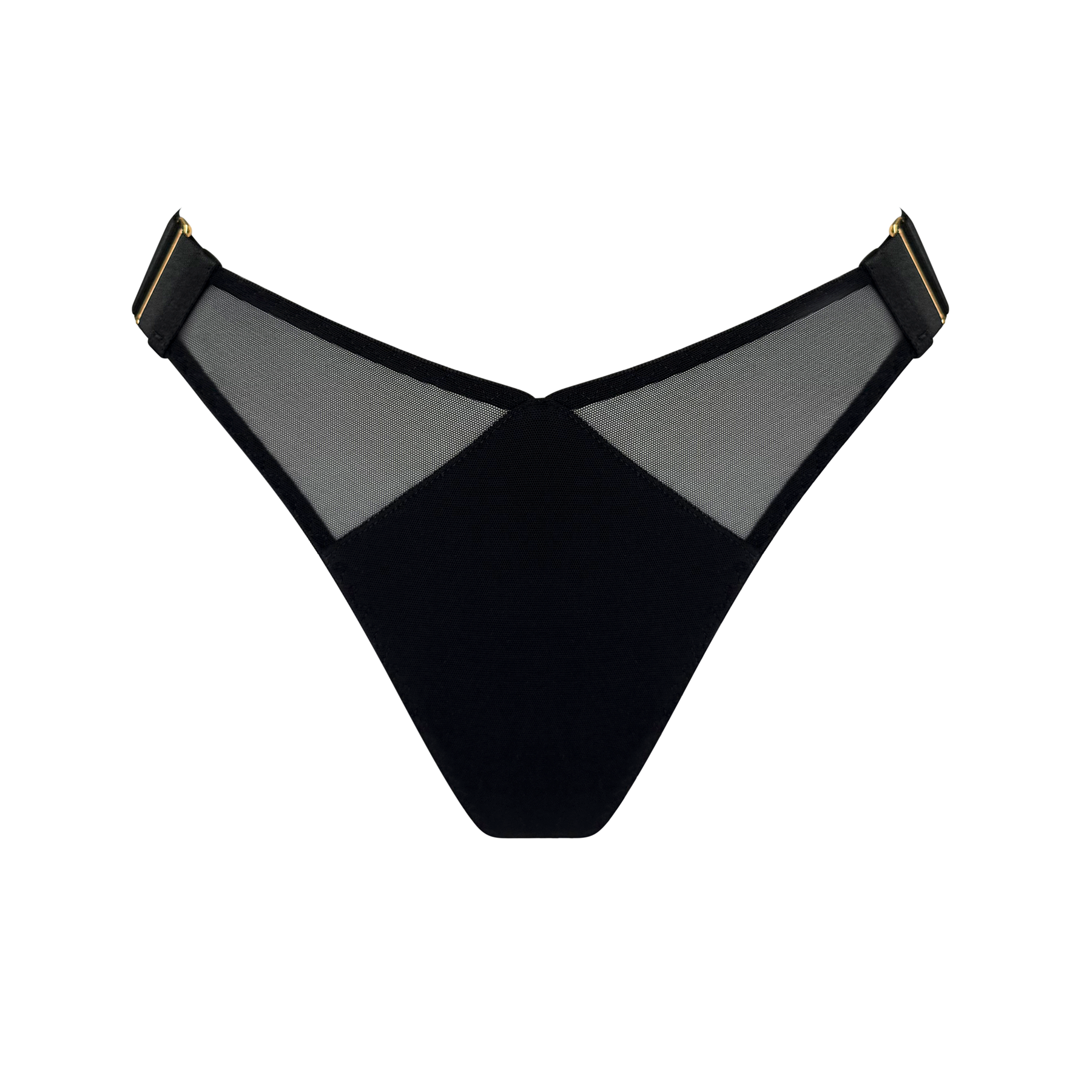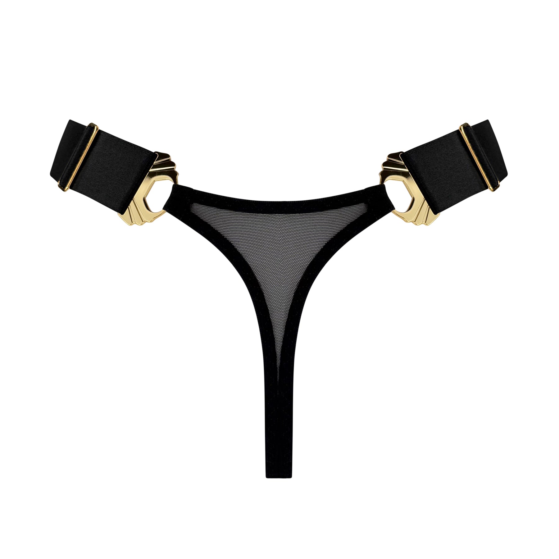 A luxury thong combining soft sheer mesh with a jersey gusset for coverage. Wide band elastic straps smooth over the hips, offering adjustability and comfort. At the back, two oversized 24k gold plated shell components meet at a mesh thong strap, creating a statement finish that captures the essence of the Melusina Collection.